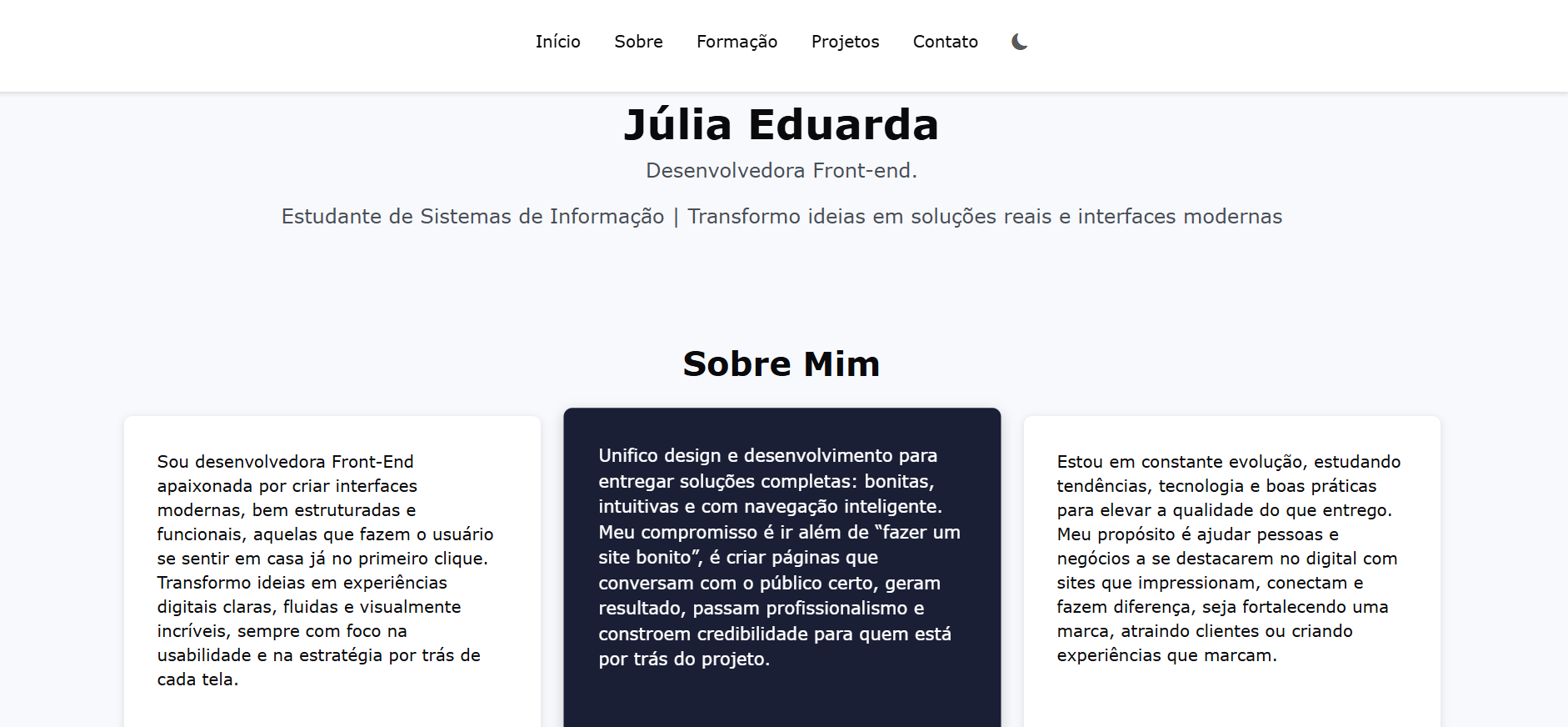 Sou desenvolvedora Front-End apaixonada por criar interfaces modernas, bem estruturadas e